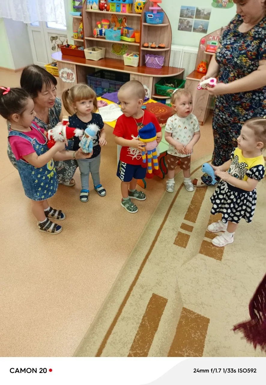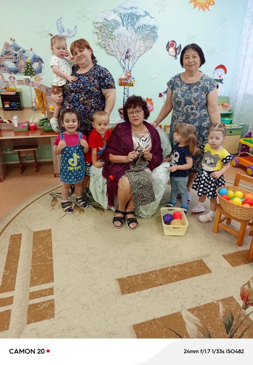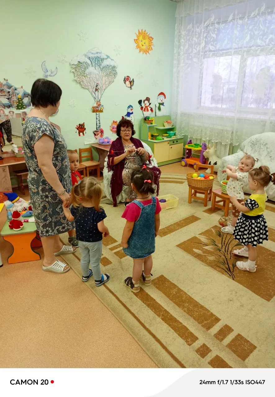 В рамках проекта «Внуковедение» в младшей группе «Улыбка» 26.12.2025г. прошло очередное мероприятие «Мягкий клубочек». В гости к деткам пришла бабушка Вики М., Татьяна Викторовна. Викина бабушка очень любит вязать. Раньше вязала для кукол, потом для дочки, а теперь для любимых внуков вяжет носочки, шарфики, кофточки и многое другое. Ещё увлекается вязанием игрушек. Это увлечение передаёт соей старшей внучки Маше, которая учится в школе. А саму Татьяну Викторовну научила вязать её мама Александра Филипповна. Детки с удовольствием поиграли с клубочками, которые принесла бабушка, обследовали их (погладили), покатали, увидели, что они разного цвета. Вместе с воспитателями и с Татьяной Викторовной поиграли в пальчиковую игру «Бабушка очки надела, за вязание присела…». Затем рассмотрели вязанные вещи и игрушки, которые принесла бабушка и даже примерили их на себя, это помогло детям окунуться в это творчество. В конце встречи поиграли в подвижные игры «Догони клубочек», «Лови клубочек». Все участники встречи остались довольны проведённым временем. Атмосфера была наполнена уютом и теплом. Такие встречи помогают детям почувствовать связь поколений.