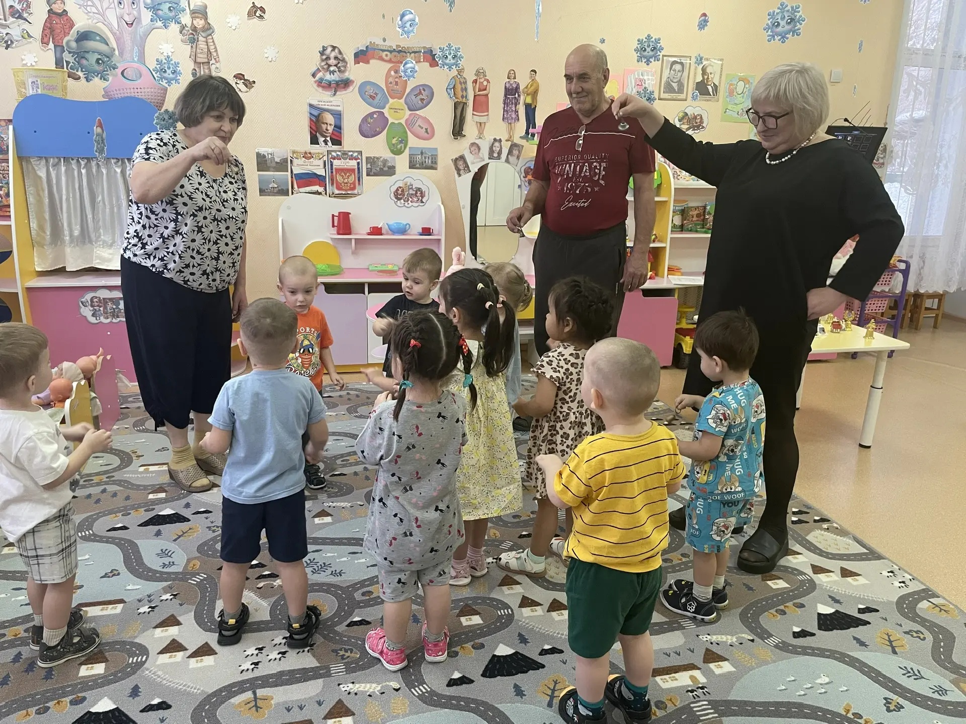 09.10.2025г. в МБДОУ «Детский сад «Сказка» в младших группах «Улыбка» и «Ромашка», состоялось, первое путешествие «Бабушкин платочек». В гости к деткам пришли их бабушки и принесли в корзинке красивые платки, а бабушка Василисы, Наталья Сергеевна принесла платки, которые связала сама. Дети вместе с воспитателями Мариной Геннадьевной, Еленой Николаевной и Екатериной Васильевной с интересом рассматривали узоры на платках, примеряли их, играли в прятки, в карусель. Встреча очень понравилась и бабушкам, и детям. Бабушки принесли детям не только свои любимые платки, но и угощенье. А дети в свою очередь нарисовали и подарили своим бабушкам красивые платочки. Такие трогательные, тёплые встречи помогают сохранить нить преемственности поколений. Педагоги поблагодарили бабушек за отзывчивость и пригласили их на следующую встречу.
