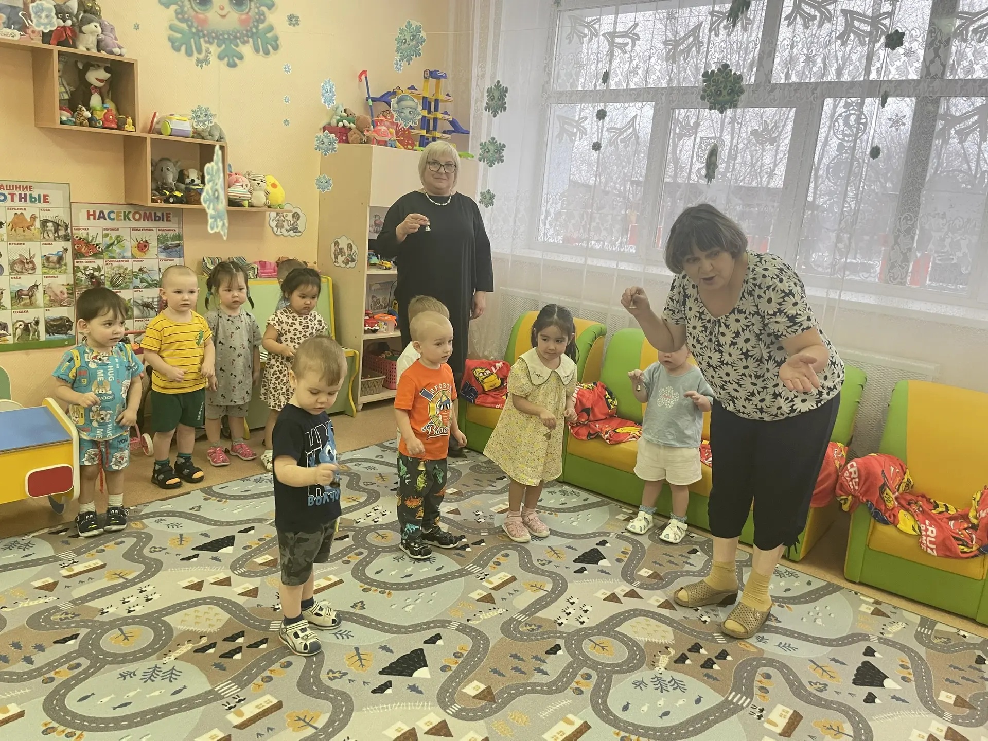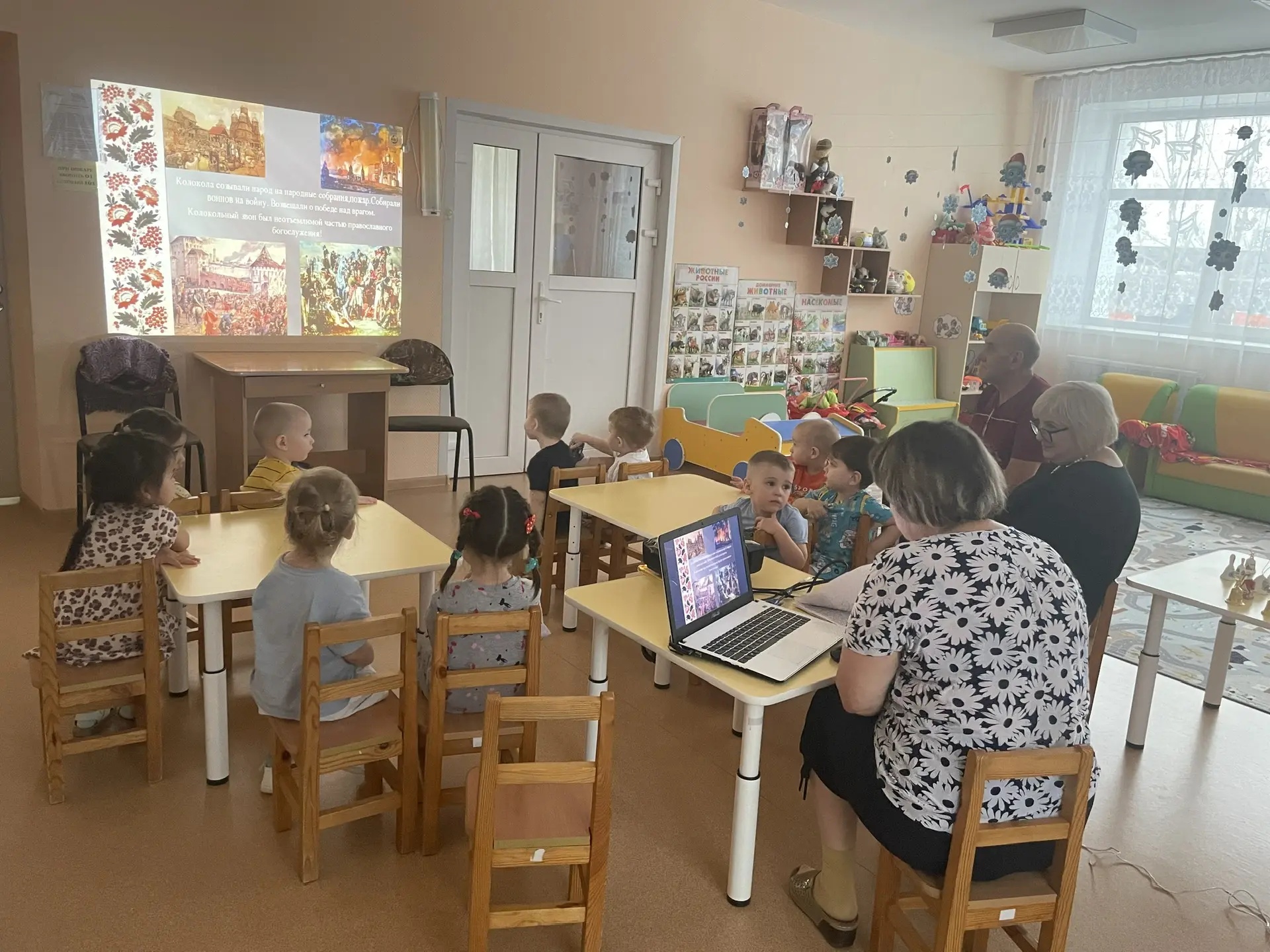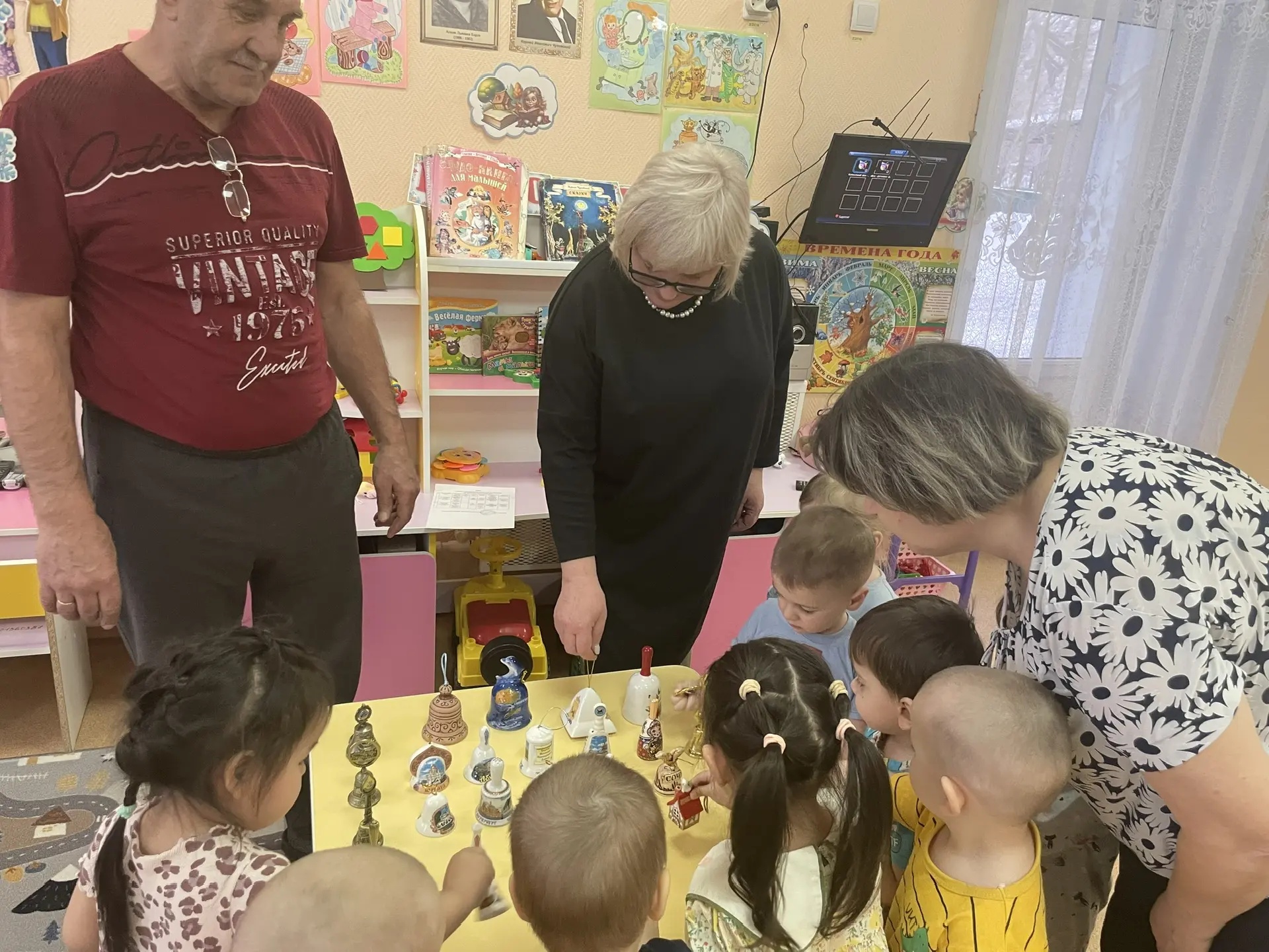 В рамках реализации проекта «Внуковедение» в младшей группе «Ромашки» МБДОУ «Детский сад «Сказка» прошла очередная тематическая встреча «Веселый колокольчик» в соответствии с модулем «Ладушки-познавашки. На очередную встречу пришли бабушка Сони и дедушка Миши. На этой встрече дети познакомились с историей колокольчика, какие бывают колокольчики, где применяются, послушали звон церковного колокола. На выставке колокольчиков ребята потрогали, звенели, рассмотрели, поиграли разными видами колокольчиков. Дедушка Александр Александрович предложил ребятам поиграть с колокольчиком и зайчиком в прятки, а бабушка Светлана Сергеевна потанцевала с ребятами весёлый танец колокольчиков. В гости на развлечение к ребятам пришёл прозрачный колокольчик и предложил его ярко разукрасить. Ребята с удовольствием красили колокольчики, а потом с удовольствие любовались своими работами. и в конце развлечения сделали большое совместное фото. Все участники встречи остались довольны проведённым мероприятием.